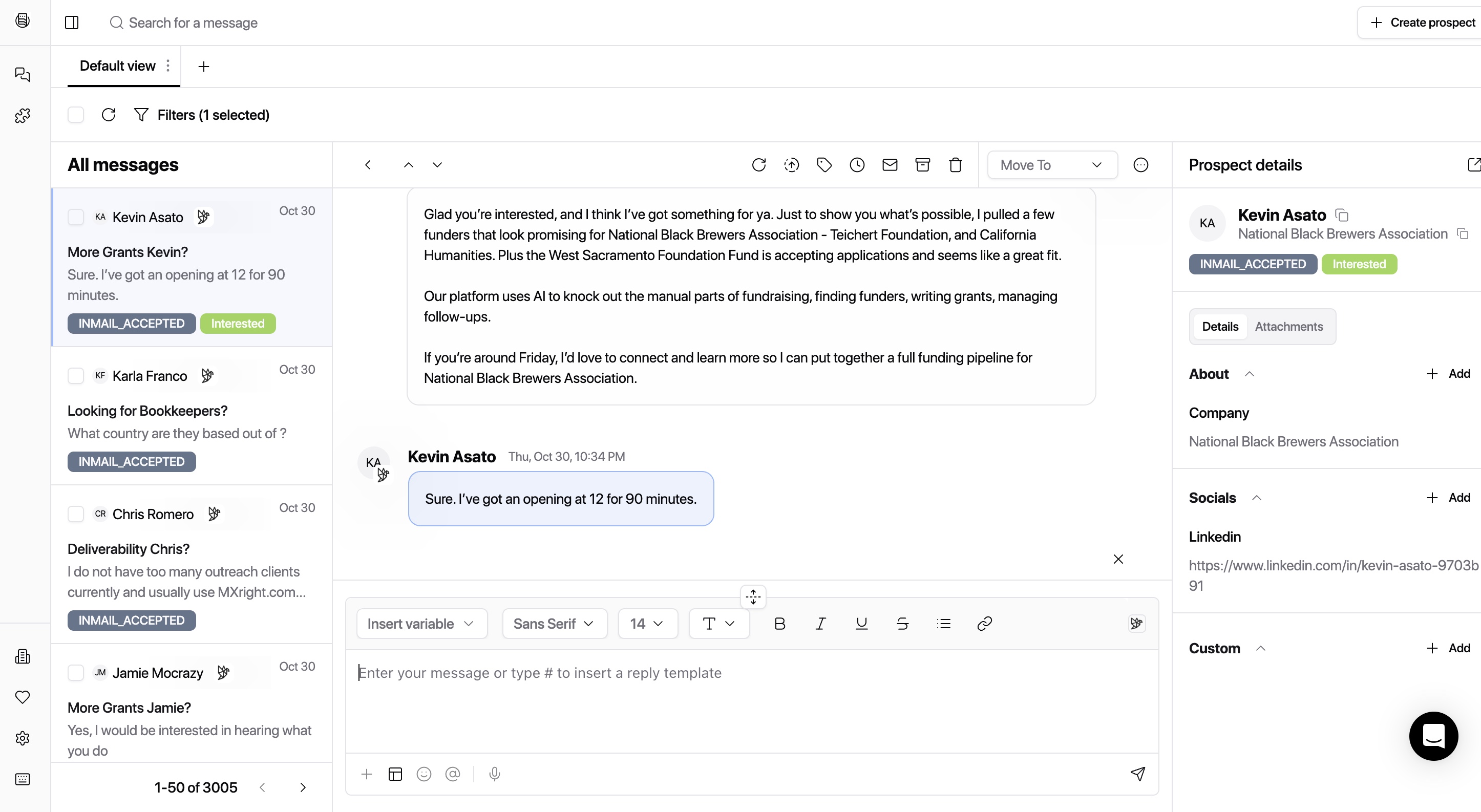 You can view the contact’s company name and LinkedIn profile directly in the inbox for additional context.
