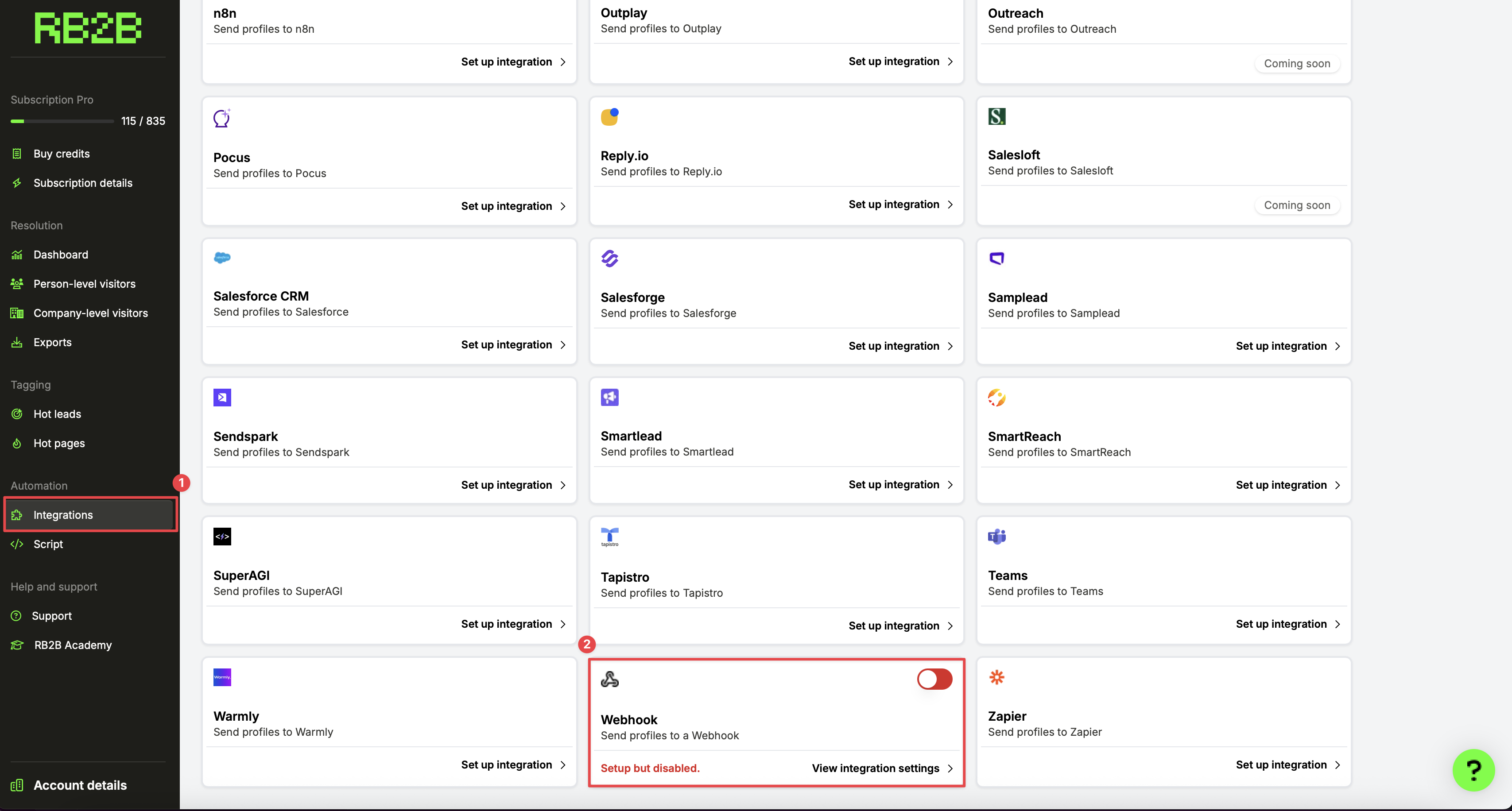 In RB2B, go to Integrations (left-hand menu)