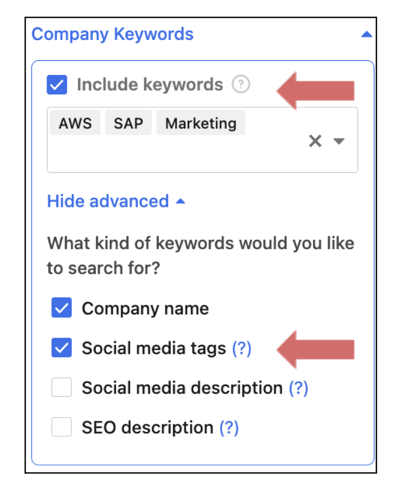 In advanced settings, Apollo allows you to choose keyword types such as company name, social media tags, social media description, and SEO description.