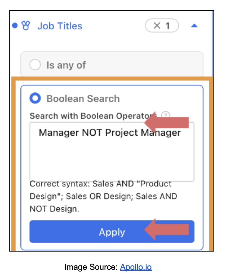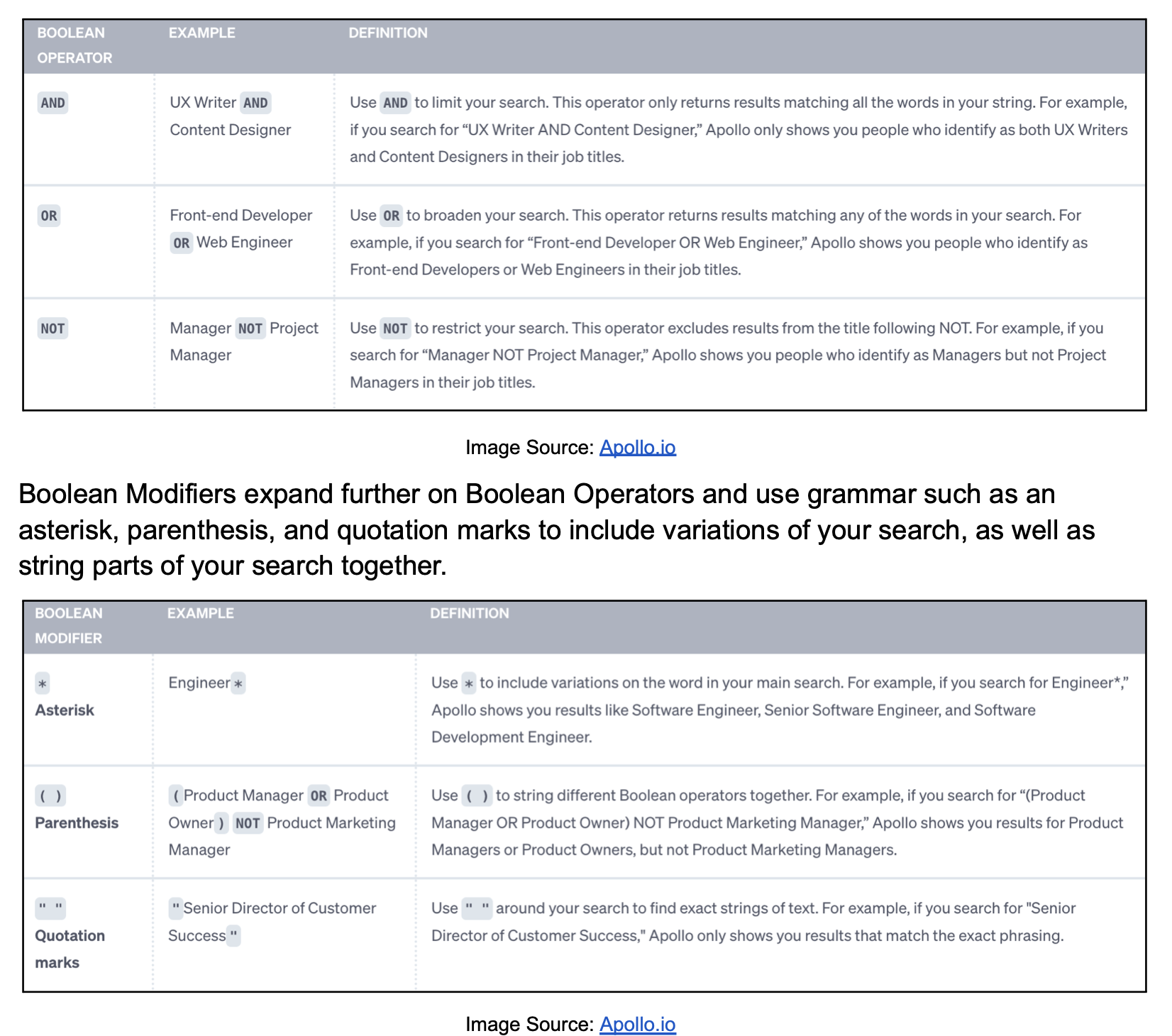 Apollo.io has both Boolean Operators and Boolean Modifiers.