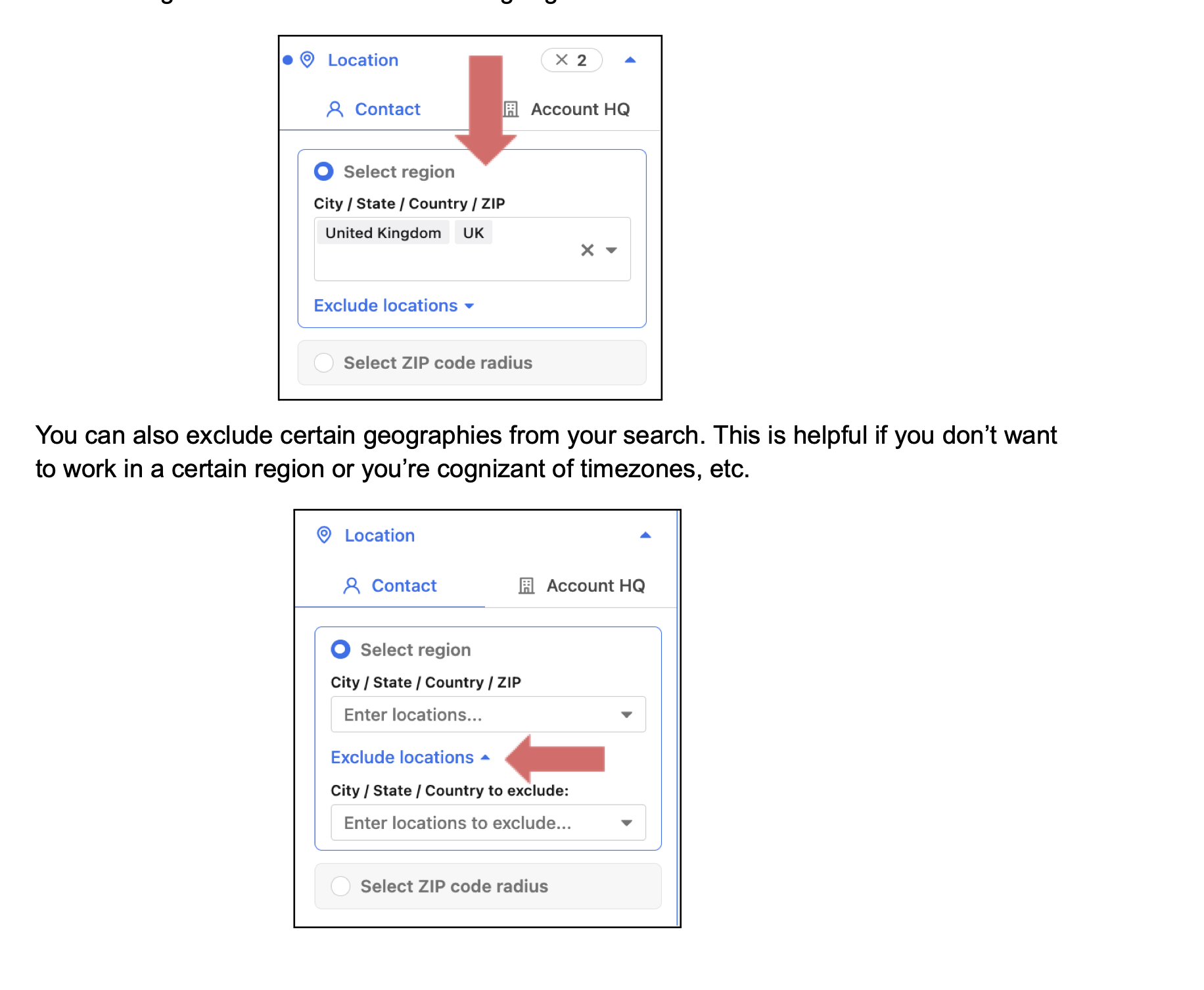Like job titles, think about your locations as you’re creating a search. You might want to reach out to those customer success managers based in the UK, so you’d have to include “United Kingdom” and “UK” when selecting regions.