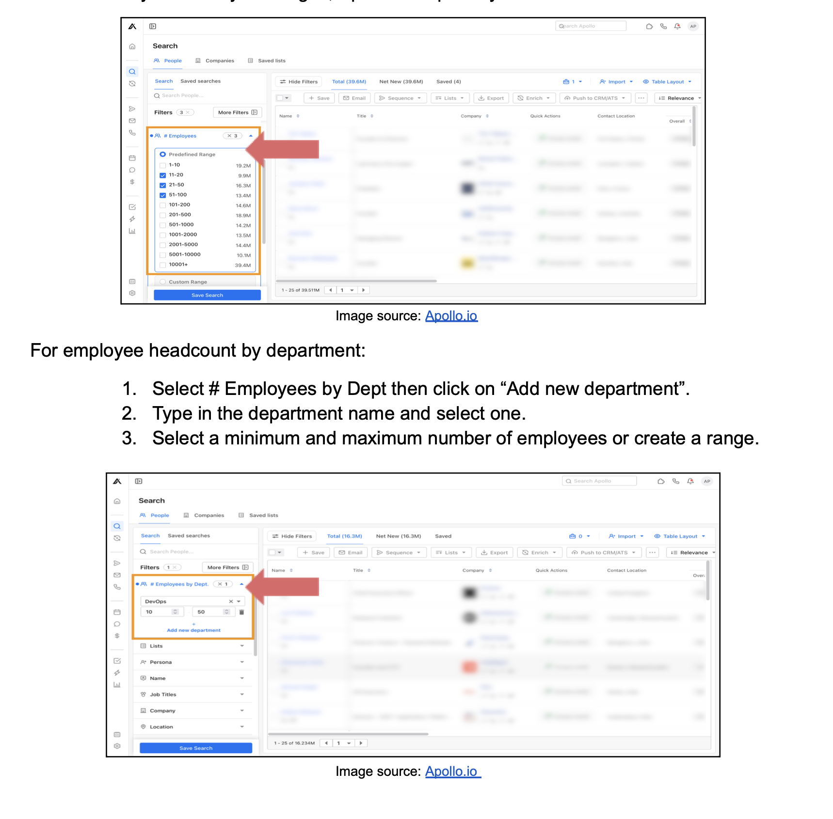 Apollo has two headcount filters: one for you to find the total company headcount and another to search by department.
